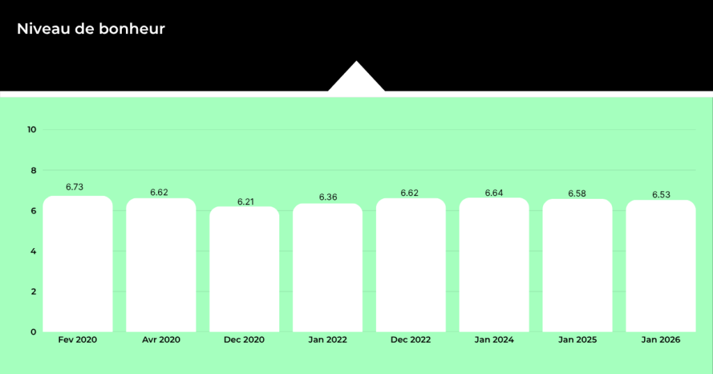 En 2020, les Belges évaluaient encore leur bonheur à 6,73 sur 10 en moyenne. Ce sentiment a brièvement augmenté pendant et après la pandémie de coronavirus, mais depuis début 2024, le niveau de bonheur est à nouveau en légère baisse. Selon les chercheurs, ces résultats sont notamment liés à l’incertitude économique et géopolitique.